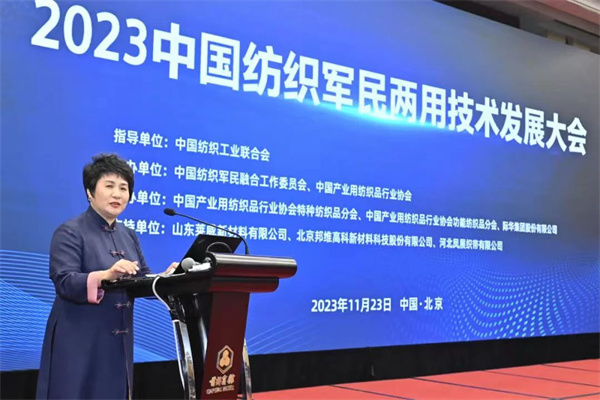 11月23日,2023中國紡織軍民兩用技術發(fā)展大會在北京召開。會議由中國紡織工業(yè)聯(lián)合會指導,中國紡織軍民融合工作委員會、中國產(chǎn)業(yè)用紡織品行業(yè)協(xié)會主辦,中國產(chǎn)業(yè)用紡織品行業(yè)協(xié)會特種紡織品分會、中國產(chǎn)業(yè)用紡織品行業(yè)協(xié)會功能紡織品分會、際華集團股份有限公司承辦,山東萊威新材料有限公司、北京邦維高科新材料科技股份限公司、河北鳳展織帶有限公司支持。