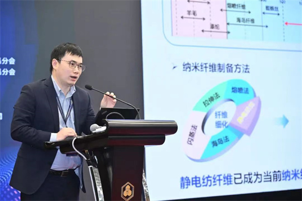 東華大學紡織科技創(chuàng)新中心副主任、教授斯陽在“超輕超彈納米纖維氣凝膠的三維構(gòu)建及功能化應用研究”主題報告中,從研究背景角度介紹了纖維材料的重要發(fā)展方向、靜電紡納米纖維材料的三維體型構(gòu)建、納米纖維氣凝膠構(gòu)建新思路、及超輕超彈纖維氣凝膠研究思路,并對高分子納米纖維氣凝膠、碳納米纖維氣凝膠、陶瓷納米纖維氣凝膠的相關性能和特點進行講解。