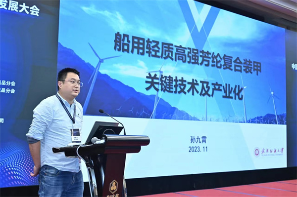武漢紡織大學復合材料與工程系主任、副教授孫九霄作“船用輕質(zhì)高強芳綸復合裝甲關鍵技術及產(chǎn)業(yè)化”主題報告,他從研究背景與總體思路、研究內(nèi)容及相關技術、主要技術經(jīng)濟指標及與國外對比、知識產(chǎn)權(quán)及第三方評價、應用推廣和經(jīng)濟社會效益情況等方面展開,詳細介紹了預活化芳綸纖維與高韌性熱塑性樹脂制備技術、織物結(jié)構(gòu)設計與復合裝甲防護性能研究、芳綸復合裝甲自動化設備研制等內(nèi)容。