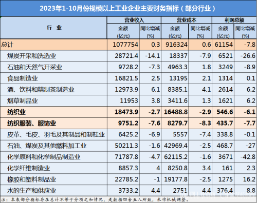 11月27日上午,國家統(tǒng)計(jì)局公布的數(shù)據(jù)顯示,今年前10個(gè)月,我國規(guī)模以上工業(yè)企業(yè)利潤總額下降7.8%,其中制造業(yè)企業(yè)利潤總額下降8.5%。相比之下,紡織及服裝服飾業(yè)企業(yè)利潤總額降幅有所收窄,表現(xiàn)略好于整體水平。