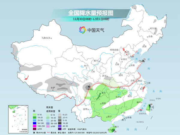具體來看,今天山東半島、黑龍江東部和中部、新疆南疆西部山區(qū)、西藏北部和東部、青海南部、川西高原北部、陜西南部、湖北西北部等地部分地區(qū)有小到中雪或雨夾雪,其中,山東半島、川西高原北部等地部分地區(qū)有大到暴雪。四川盆地、湖南北部和南部、江西南部、福建中西部、湖北南部、貴州大部、云南東部、廣西、廣東北部、海南島、臺灣島中北部等地部分地區(qū)有小到中雨,其中,海南島東部、臺灣島北部局地有大雨。