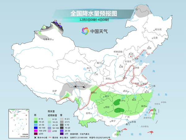 后天,內(nèi)蒙古東北部、黑龍江西北部、新疆北疆北部和北疆東部、西藏東部、青海南部、川西高原北部等地部分地區(qū)有小到中雪或雨夾雪,其中,新疆北疆部分地區(qū)有大到暴雪,局地大暴雪。四川盆地、重慶、湖南、江西、浙江南部、福建、廣西北部、廣東北部、云南南部、海南島、臺灣島等地部分地區(qū)有小雨,其中,湖南中西部和南部、廣西東北部等地部分地區(qū)有中雨。