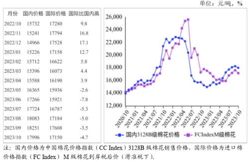(一)國內(nèi)棉價止?jié)q轉(zhuǎn)跌。本月,新疆棉花大規(guī)模采收,加之儲備棉持續(xù)銷售,進口棉不斷到港,棉花供給階段性充裕;下游紡織市場復蘇程度有限,紡企新增訂單量不足,需求相對疲軟。新棉銷售壓力增大,棉花價格小幅下跌,銷售14進度較往年偏慢。據(jù)國家棉花市場監(jiān)測系統(tǒng)數(shù)據(jù),截至10月26日,全國新棉采摘進度67.5%,同比下降6.0個百分點;全國交售率55.2%,同比下降2.7個百分點。據(jù)《中國棉花工業(yè)庫存調(diào)查報告》數(shù)據(jù),10月初全國棉花工業(yè)庫存63.5萬噸,環(huán)比增6.4%,同比增12%。采購意向調(diào)查顯示,10月初準備采購棉花的企業(yè)占56.1%,環(huán)比增1.5個百分點,同比減3.0個百分點,比近五年同期平均水平減少0.8個百分點。10月份,國內(nèi)3128B級棉花月均價每噸17996元,環(huán)比跌1.4%,同比漲14.4%。鄭棉期貨主力合約(CF 401)月結(jié)算價每噸16095元,環(huán)比跌6.3%,同比漲19.7%。