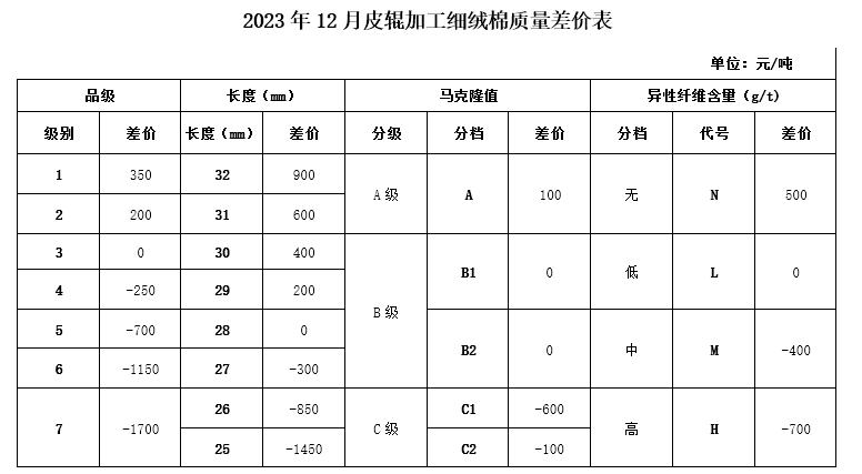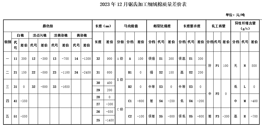 根據(jù)《中國棉花協(xié)會國產(chǎn)棉質(zhì)量差價表管理辦法》規(guī)定,現(xiàn)正式發(fā)布2023年12月《鋸齒加工細(xì)絨棉質(zhì)量差價表》、《皮輥加工細(xì)絨棉質(zhì)量差價表》和《長絨棉質(zhì)量差價表》(單位:元/噸)。