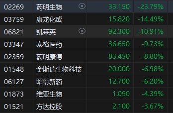 醫(yī)藥外包概念股領跌,藥明生物跌近24%,已暫停交易。消息面上,藥明生物今日在港交所公告,公司股份已于12月4日10時49分在香港聯(lián)合交易所有限公司暫停買賣,以待刊發(fā)可能構成公司內幕消息的公告。藥明生物今日在盤前召開經營交流會,下調部分業(yè)務板塊營收預期,其中預期2023年,藥物開發(fā)(D)營收下降18%-20%,生產(M)營收下降15%-18%。兩塊收入下降導致全年營收預期從30%增長下調到10%左右。