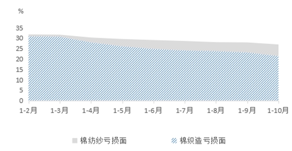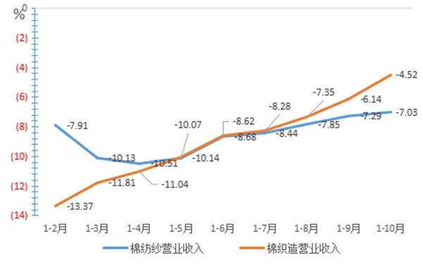 棉紡織行業(yè)主要經(jīng)濟(jì)指標(biāo)降幅持續(xù)收窄。據(jù)國(guó)家統(tǒng)計(jì)局?jǐn)?shù)據(jù),1-10月份,規(guī)模以上棉紡紗企業(yè)營(yíng)業(yè)收入同比下降7.03%,降幅較1-9月份收窄0.26個(gè)百分點(diǎn),利潤(rùn)總額同比下降3.11%,降幅較1-9月份收窄10.97個(gè)百分點(diǎn),虧損面26.90%,較1-9月收窄0.98個(gè)百分點(diǎn);棉織造企業(yè)營(yíng)業(yè)收入同比下降4.52%,降幅較1-9月份收窄1.89個(gè)百分點(diǎn),利潤(rùn)總額同比下降4.83%,降幅較1-9月份收窄9.81個(gè)百分點(diǎn),虧損面21.31%,降幅較1-9月份收窄1.73個(gè)百分點(diǎn)。棉紡織企業(yè)效益逐步改善,1-10月份規(guī)模以上棉紡紗和棉織造業(yè)營(yíng)收利潤(rùn)總額降幅小于全國(guó)規(guī)模以上工業(yè)企業(yè)和紡織行業(yè)。