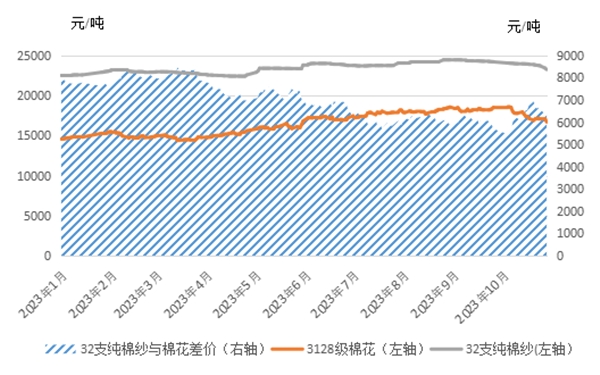 10月,國(guó)內(nèi)棉花期現(xiàn)貨價(jià)格大幅走低,下游整體需求持續(xù)低迷,棉紗和坯布價(jià)格跟隨下跌,成品庫(kù)存持續(xù)累積,紡織企業(yè)降價(jià)促銷(xiāo),但成交有限,資金壓力增加,后續(xù)新增訂單不足。以普梳32支純棉紗與3128B標(biāo)準(zhǔn)級(jí)棉花的價(jià)差為代表,10月份花紗價(jià)差仍維持在6000元/噸左右,按照即期利潤(rùn),企業(yè)處于虧損狀態(tài)。