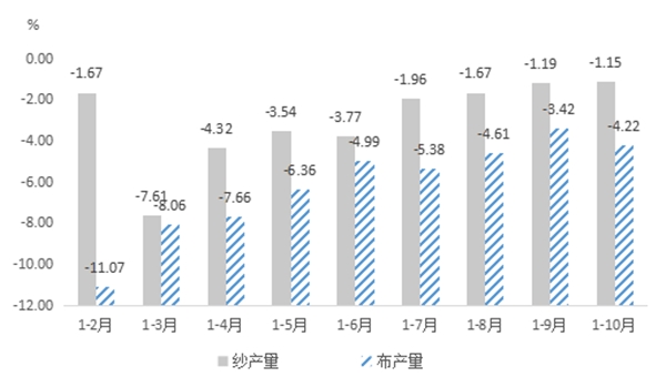 訂單不足,紗、布產(chǎn)量下降。據(jù)國(guó)家統(tǒng)計(jì)局?jǐn)?shù)據(jù),1-10月份,規(guī)模以上棉紡織企業(yè)紗產(chǎn)量累計(jì)同比下降1.15%,降幅較1-9月份收窄0.04個(gè)百分點(diǎn);布產(chǎn)量累計(jì)同比下降4.22%,降幅較1-9月份擴(kuò)大0.8個(gè)百分點(diǎn)。