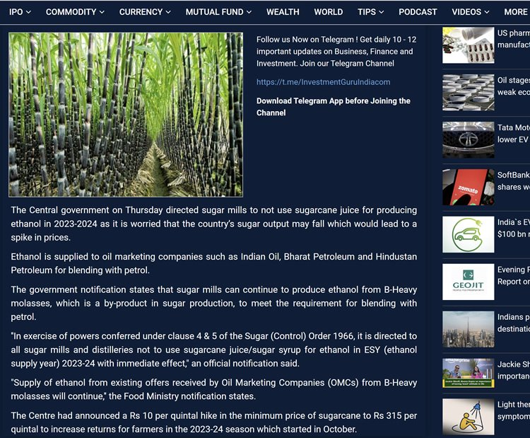 印度國內的媒體也報道了政府禁止將甘蔗汁或糖漿用于生產乙醇: