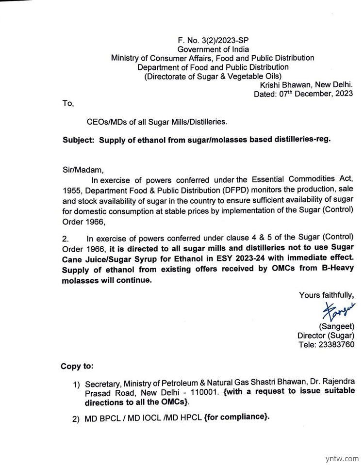 該政府文件主要意思是:為確保印度國內市場有足夠的食糖供應以及穩(wěn)定其國內糖價,指示糖廠在2023/24榨季年度不要使用甘蔗汁或糖漿生產乙醇,該政府文件立即生效。