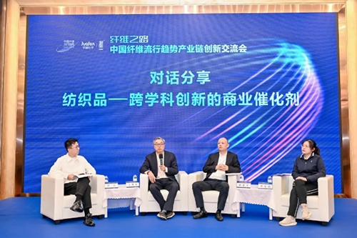 紡織品作為多學(xué)科交叉的創(chuàng)新產(chǎn)物,從石化礦物煉化、農(nóng)林種植,到化學(xué)單體精制、聚合、紡絲成形、織造、染整、服裝設(shè)計(jì)等,每一個(gè)環(huán)節(jié)都是涉及不同專業(yè)的深度融合。在“紡織品—跨學(xué)科創(chuàng)新的商業(yè)催化劑”對(duì)話環(huán)節(jié),東華大學(xué)研究員王華平、華峰化學(xué)市場(chǎng)部副經(jīng)理孫律平等圍繞趨勢(shì)、可持續(xù)發(fā)展、產(chǎn)品研發(fā)等話題進(jìn)行了精彩分享。洪巖主持對(duì)話環(huán)節(jié)。