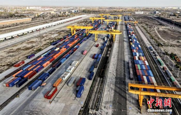 霍爾果斯鐵路口岸有序排列的集裝箱