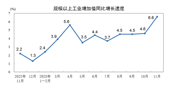 11月份,規(guī)模以上工業(yè)增加值同比實(shí)際增長(zhǎng)6.6%(增加值增速均為扣除價(jià)格因素的實(shí)際增長(zhǎng)率)。從環(huán)比看,11月份,規(guī)模以上工業(yè)增加值比上月增長(zhǎng)0.87%。1—11月份,規(guī)模以上工業(yè)增加值同比增長(zhǎng)4.3%。