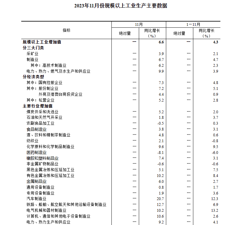 分三大門(mén)類(lèi)看,11月份,采礦業(yè)增加值同比增長(zhǎng)3.9%,制造業(yè)增長(zhǎng)6.7%,電力、熱力、燃?xì)饧八a(chǎn)和供應(yīng)業(yè)增長(zhǎng)9.9%。