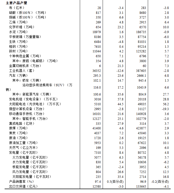 分產(chǎn)品看,11月份,620種產(chǎn)品中有367種產(chǎn)品產(chǎn)量同比增長(zhǎng)。其中,鋼材11044萬(wàn)噸,同比增長(zhǎng)4.2%;水泥18979萬(wàn)噸,增長(zhǎng)1.6%;十種有色金屬650萬(wàn)噸,增長(zhǎng)7.1%;乙烯269萬(wàn)噸,增長(zhǎng)4.8%;汽車(chē)295.3萬(wàn)輛,增長(zhǎng)23.6%,其中新能源汽車(chē)100.6萬(wàn)輛,增長(zhǎng)35.6%;發(fā)電量7310億千瓦時(shí),增長(zhǎng)8.4%;原油加工量5953萬(wàn)噸,增長(zhǎng)0.2%。