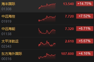 海運(yùn)股齊漲,海豐國際漲近15%。消息面上,近期越來越多船只在行至紅海水域時(shí)遭到也門胡塞武裝襲擊,促使全球主要航運(yùn)公司暫時(shí)避開該區(qū)域。華創(chuàng)證券表示,本次事件或明顯增加保險(xiǎn)費(fèi)率、繞行成本等貨輪成本,建議近期關(guān)注該區(qū)域形勢及運(yùn)價(jià)走勢。參考過往蘇伊士運(yùn)河堵塞復(fù)盤,原油、成品油運(yùn)價(jià)反應(yīng)更為明顯??紤]船只繞行好望角,運(yùn)距拉長,遠(yuǎn)距離運(yùn)輸?shù)腣LCC(超大型油輪)或受益,推薦中遠(yuǎn)海能(7.32, 0.00, 0.00%)。