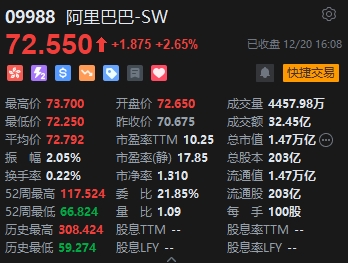阿里巴巴全天收漲2.65%。12月20日上午,阿里巴巴宣布,阿里巴巴集團(tuán)CEO、淘天集團(tuán)董事長(zhǎng)吳泳銘兼任淘天集團(tuán)CEO。自此,吳泳銘將同時(shí)擔(dān)任阿里巴巴集團(tuán)和淘天集團(tuán)、阿里云智能集團(tuán)三項(xiàng)CEO職務(wù)。另外,淘天集團(tuán)原CEO戴珊將協(xié)助籌建阿里巴巴集團(tuán)資產(chǎn)管理公司。