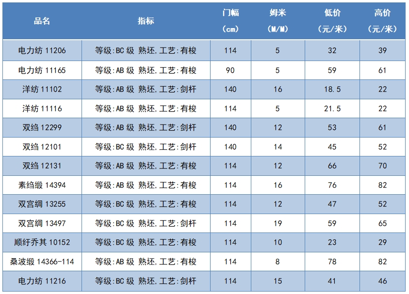 本周綢緞指數(shù)協(xié)作單位成交價格區(qū)間