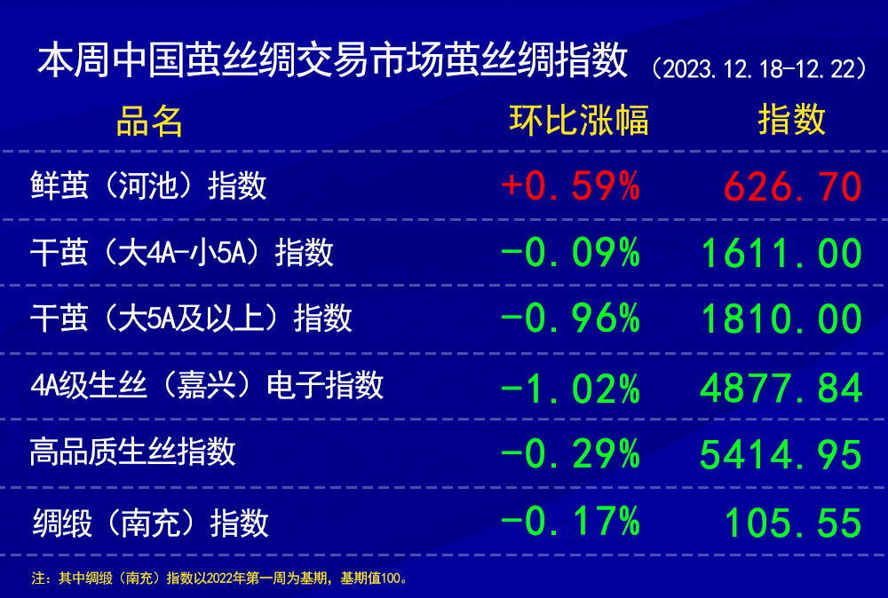 本周繭絲綢各指數(shù)多數(shù)略收跌(20231222)