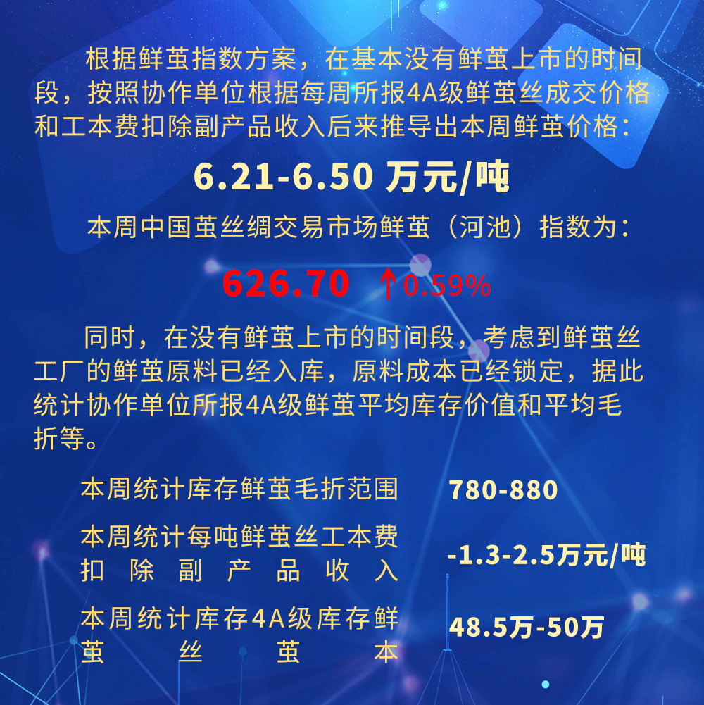 鮮繭指數(shù)上,按照規(guī)則,在鮮繭上市結(jié)束的時間段,本周開始,進入?yún)f(xié)作單位鮮繭絲4A級現(xiàn)貨價格結(jié)合工本費和庫存繭毛折等數(shù)據(jù)進行倒推本周的鮮繭市場價值。本周鮮繭指數(shù)環(huán)比有上漲。統(tǒng)計的協(xié)作單位的庫存鮮繭繭本普遍較高,本周統(tǒng)計生產(chǎn)轉(zhuǎn)速為100-180。