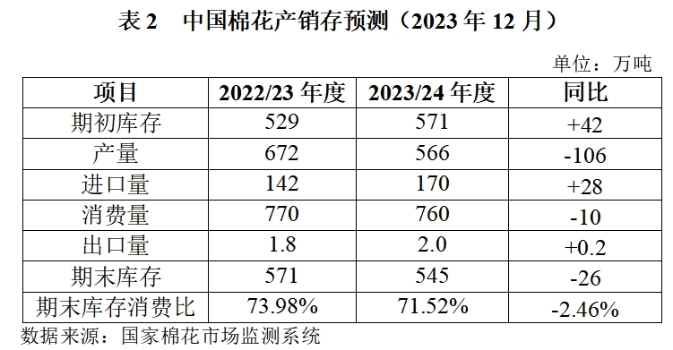 基于相關(guān)專題調(diào)查和對(duì)國(guó)內(nèi)外經(jīng)濟(jì)環(huán)境及市場(chǎng)狀況的分析,本期國(guó)家棉花市場(chǎng)監(jiān)測(cè)系統(tǒng)對(duì)2023/24年度中國(guó)棉花產(chǎn)銷存預(yù)測(cè)未做調(diào)整: