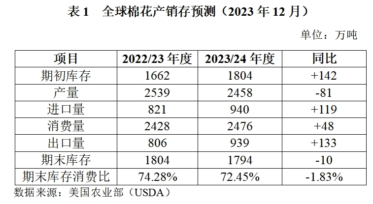 12月美國(guó)農(nóng)業(yè)部全球棉花產(chǎn)銷存預(yù)測(cè)數(shù)據(jù)顯示,2023/24年度,全球棉花期初庫(kù)存1804萬(wàn)噸;產(chǎn)量2458萬(wàn)噸,環(huán)比減少12萬(wàn)噸,同比減少81萬(wàn)噸;消費(fèi)2476萬(wàn)噸,環(huán)比減少34萬(wàn)噸,同比增加48萬(wàn)噸;期末庫(kù)存1794萬(wàn)噸,環(huán)比增加20萬(wàn)噸,同比減少10萬(wàn)噸;期末庫(kù)存消費(fèi)比72.45%,環(huán)比增加1.77個(gè)百分點(diǎn),同比減少1.83個(gè)百分點(diǎn)。