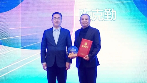 中國棉紡織行業(yè)協(xié)會總工程師葉戩春與陳克勤為新當(dāng)選的常務(wù)副會長、副會長頒發(fā)證書