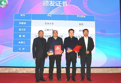 中國棉紡織行業(yè)協(xié)會副會長景慎全與陳克勤為中國棉紡織行業(yè)協(xié)會噴氣渦流紡行業(yè)分會專家頒發(fā)聘書