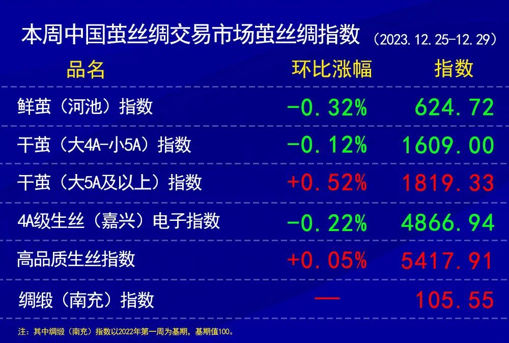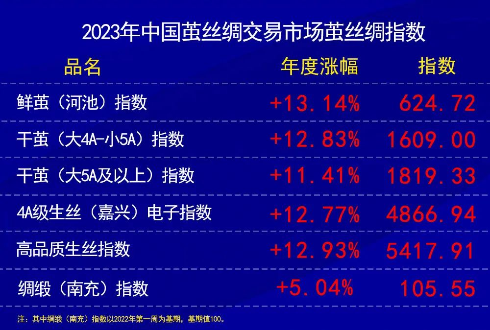 2023年,4A級生絲電子指數(shù)今年漲幅為12.77%。從供應(yīng)鏈上的繭絲綢各環(huán)節(jié)的現(xiàn)貨指數(shù)來看,鮮繭指數(shù)今年漲幅為13.14%;兩個(gè)等級的蠶繭指數(shù)漲幅分別為12.83%和11.41%;高品質(zhì)生絲指數(shù)漲幅為12.93%;綢緞指數(shù)今年漲幅為5.04%。