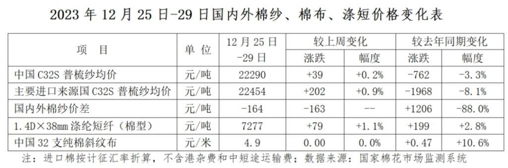 上周(2023年12月25日-29日),國內(nèi)外棉花、棉紗價(jià)格均有所上漲;國內(nèi)滌綸短纖價(jià)格也出現(xiàn)上漲。