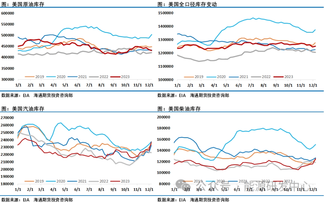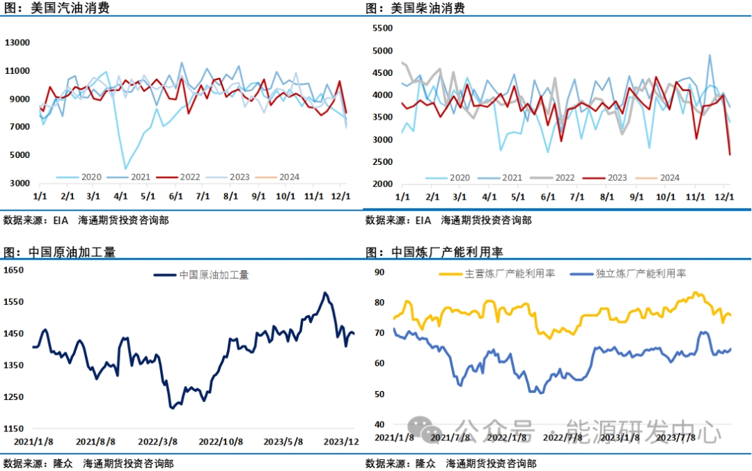 美國能源信息署(EIA)周四發(fā)布的周度報(bào)告顯示,上周美國汽油庫存增長1090萬桶,達(dá)到2.37億桶,創(chuàng)下1993年5月以來的最大增幅。而精煉油庫存同樣大增1009萬桶。美國雙旦假期成品油需求大幅下滑進(jìn)一步給市場(chǎng)提醒,雖然是假期因素,但顯然原油市場(chǎng)需求端拖累了油價(jià)表現(xiàn),在經(jīng)過了2023年疫情之后的修復(fù)階段之后,全球石油需求增長將放緩,目前主流機(jī)構(gòu)普遍預(yù)計(jì)2024年石油需求增長在100-150萬桶/日之間。需求端的好消息是中國商務(wù)部于近日下發(fā)2024年第二批原油非國營貿(mào)易進(jìn)口允許量,配額總量為17901萬噸,2024年前兩批進(jìn)口原油配額已下發(fā)18269萬噸,多數(shù)企業(yè)全年配額已全部發(fā)放完畢,較2023年實(shí)際執(zhí)行量(不含第一批2000萬)上漲約0.7%。另外商務(wù)部信息顯示中國成品油出口2024年成品油出口配額4000萬噸以上,超過2023年的3999萬噸,2024年出口配額有兩批,第一批成品油出口配額正式下發(fā),共計(jì)1900萬噸,環(huán)比上漲58%,同比上漲0.05%。其中,一般貿(mào)易出口配額總量為1440萬噸,加工貿(mào)易出口配額為460萬噸;2024年1月中石油、中石化、中海油及中化出口計(jì)劃量出爐,四大主營成品油出口計(jì)劃總量為370萬噸,較2023年12月增長135.5萬噸,增幅57.91%,同比2023年1月增長11.2萬噸,增幅3.13%。