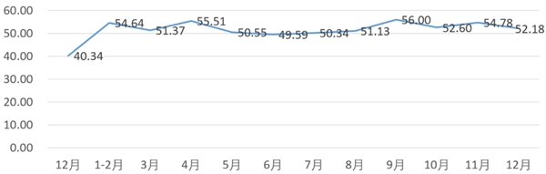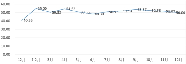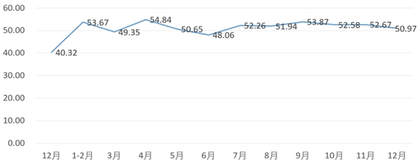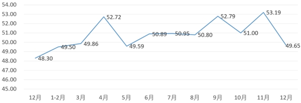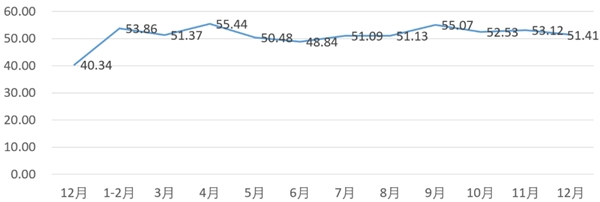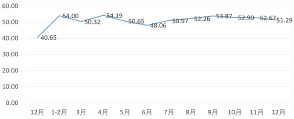 分項(xiàng)指數(shù)中,銷(xiāo)量指數(shù)為52.18,比11月的54.78下降2.60個(gè)百分點(diǎn);平均售價(jià)指數(shù)為51.41,比11月的53.12下降1.71個(gè)百分點(diǎn);盈利指數(shù)為51.76,比11月的53.84下降2.08個(gè)百分點(diǎn);綜合成本費(fèi)用指數(shù)為49.65,比11月的47.54上升2.11個(gè)百分點(diǎn);庫(kù)存指數(shù)為50.14,比11月的49.78上升0.36個(gè)百分點(diǎn);電商銷(xiāo)售指數(shù)為49.65,比11月的53.19下降3.54個(gè)百分點(diǎn)。