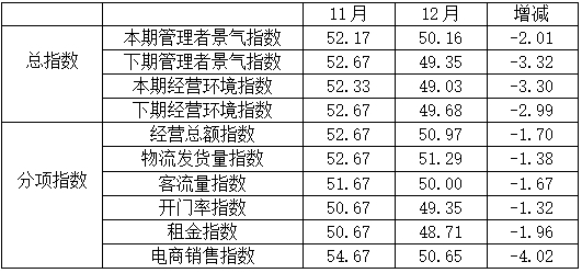 數(shù)據(jù)顯示,管理者方面,下期管理者景氣指數(shù)為49.35,比11月的52.67下降3.32個(gè)百分點(diǎn);下期經(jīng)營(yíng)環(huán)境指數(shù)為49.68,比11月的52.67下降2.99個(gè)百分點(diǎn)。商戶(hù)方面,下期商戶(hù)景氣指數(shù)為48.94,比11月的54.49下降5.55個(gè)百分點(diǎn);下期經(jīng)營(yíng)環(huán)境指數(shù)為48.31,比11月的54.20下降5.89個(gè)百分點(diǎn)。可見(jiàn)管理者與商戶(hù)對(duì)1月經(jīng)營(yíng)信心不足。
