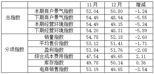 從商戶(hù)景氣指數(shù)來(lái)看,總指數(shù)中,12月商戶(hù)景氣指數(shù)為50.80,比11月的52.04下降1.24個(gè)百分點(diǎn);經(jīng)營(yíng)環(huán)境指數(shù)為49.15,比11月的54.49下降5.34個(gè)百分點(diǎn)。