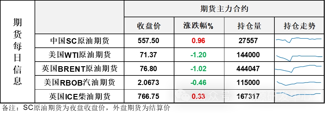 【1】WTI主力原油期貨收跌0.87美元,跌幅1.2%,報(bào)71.37美元/桶;布倫特主力原油期貨收跌0.79美元,跌幅1.02%,報(bào)76.8美元/桶;INE原油期貨收漲0.96%,報(bào)557.5元。