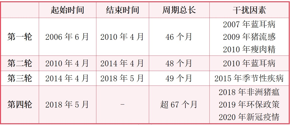 根據(jù)以往經(jīng)驗,一輪完整的豬周期需要3-4年的時間。2006年以來,我國生豬行業(yè)經(jīng)歷過3輪完整的豬周期。