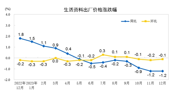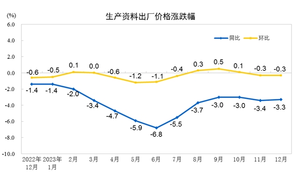 2023年12月份,全國(guó)工業(yè)生產(chǎn)者出廠價(jià)格同比下降2.7%,環(huán)比下降0.3%;工業(yè)生產(chǎn)者購(gòu)進(jìn)價(jià)格同比下降3.8%,環(huán)比下降0.2%。2023年全年,工業(yè)生產(chǎn)者出廠價(jià)格比上年下降3.0%,工業(yè)生產(chǎn)者購(gòu)進(jìn)價(jià)格下降3.6%。