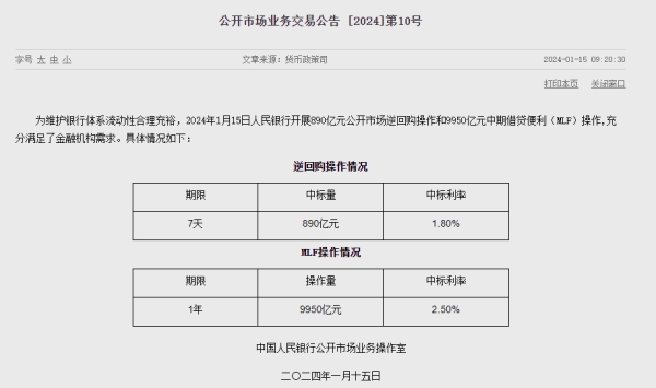 中國人民銀行在15日開展了890億元7天期逆回購操作,中標(biāo)利率為1.8%;同時(shí)開展9950億元1年期中期借貸便利(MLF)操作,中標(biāo)利率為2.5%,與此前一致。Wind數(shù)據(jù)顯示,當(dāng)日500億元逆回購到期,因此單日凈投放10340億元。