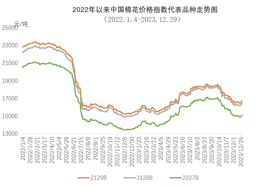2023年,國(guó)內(nèi)棉價(jià)先漲后跌,年初中國(guó)棉花價(jià)格指數(shù)(CCIndex3128B)延續(xù)上年底走勢(shì)緩慢回升,1月3日全年最低點(diǎn)為15050元/噸。隨著國(guó)內(nèi)經(jīng)濟(jì)數(shù)據(jù)表現(xiàn)向好,市場(chǎng)預(yù)期增強(qiáng),原料需求回升,國(guó)內(nèi)棉價(jià)持續(xù)上漲,9月4日達(dá)到全年最高點(diǎn)為18433元/噸,隨后受新棉上市、宏觀調(diào)控等多種因素影響,棉價(jià)逐步回落,全年平均價(jià)格為16767元/噸,同比下跌10.8%。
