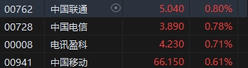 電訊服務(wù)板塊逆勢上漲,中國聯(lián)通、中國電信漲近1%。摩通指,去年中國電信商表現(xiàn)一直跑贏同期恒指40%以上,認(rèn)為投資者今年將繼續(xù)看好電信股,因?yàn)樵趧?dòng)蕩的市況中更具防守性,而且股息回報(bào)吸引,重申中國移動(dòng)(66.15, 0.00, 0.00%)為行業(yè)首選,維持“增持”評(píng)級(jí),目標(biāo)價(jià)74.5港元。