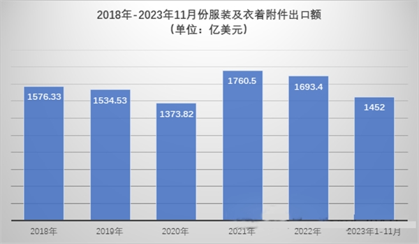 ● 傳統(tǒng)出口優(yōu)勢不再。 根據(jù)中國海關(guān)數(shù)據(jù),2023年11月當月服裝及衣著附件出口125.5億美元,同比下降2.8%,降幅比10月收窄5.9個百分點,這也是中國服裝出口在2023年連續(xù)第7個月同比下降。