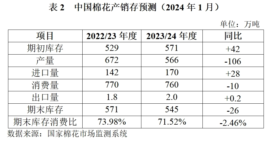 2023/24年度中國棉花期初庫存為571萬噸,同比增加42萬噸;產(chǎn)量566萬噸,同比減少106萬噸;進(jìn)口量170萬噸,同比增加28萬噸;消費量760萬噸,同比減少10萬噸;出口量2萬噸,同比增加0.2萬噸;期末庫存545萬噸,同比減少26萬噸;庫存消費比為71.52%,較上年度下降2.46個百分點。