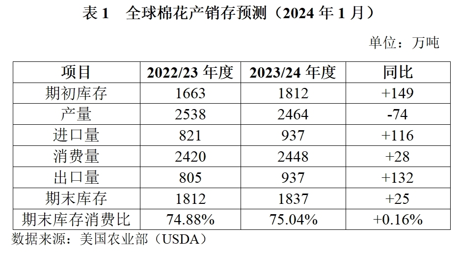 據(jù)美國農(nóng)業(yè)部預(yù)測,2023/24年度全球棉花期初庫存1812萬噸;產(chǎn)量2464萬噸,同比減少74萬噸;消費量2448萬噸,同比增加28萬噸;期末庫存1837萬噸,同比增加25萬噸;期末庫存消費比75.04%,同比增加0.16個百分點。