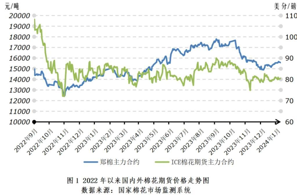2023年12月中旬以來,國內(nèi)銀行紛紛下調(diào)存款掛牌利率,中國人民銀行保持流動性適度充裕,元旦和春節(jié)節(jié)日效應(yīng)帶動紡織廠訂單階段性回暖,下游紗、布流動性增強(qiáng),棉花加工進(jìn)入收尾階段,國內(nèi)棉價小幅波動上行。截至2024年1月15日,鄭州商品交易所棉花期貨主力合約結(jié)算價15485元/噸,較2023年12月均價上漲1.5%;代表內(nèi)地標(biāo)準(zhǔn)級皮棉市場價格的國家棉花價格B指數(shù)16421元/噸,較2023年12月均價上漲1%。