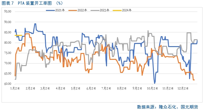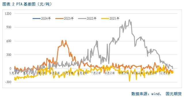 上周PTA 2405合約價格于周一下破均線系統(tǒng),之后在5700一線受到支撐企穩(wěn),主要下游聚酯略有減產,但尚未對原料形成拖累。但上游由于地緣政治的影響,價格波動加大,因此上周PTA市場交易的主要邏輯是跟隨成本端波動。步入本周,PTA加工費持續(xù)壓縮,而16日福海創(chuàng)裝置開工降負,導致價格略有修復。從基差上來看,近期基差較上周來看略有縮小,截至1月15日,PTA價差縮小至-32,但相比2022年和2023年同期來看,略有擴大,從基差趨勢上來看,一季度基差存在擴大的預期。