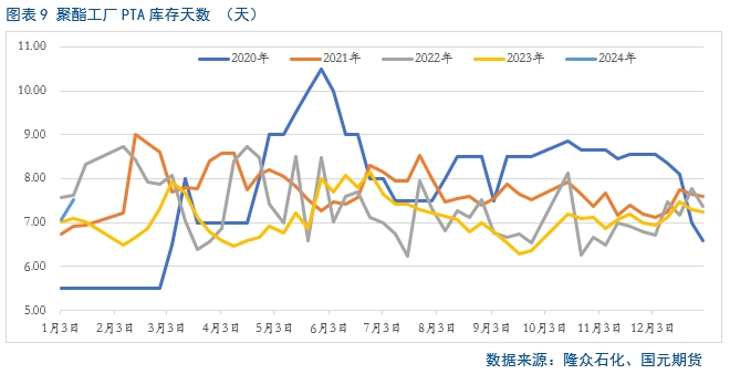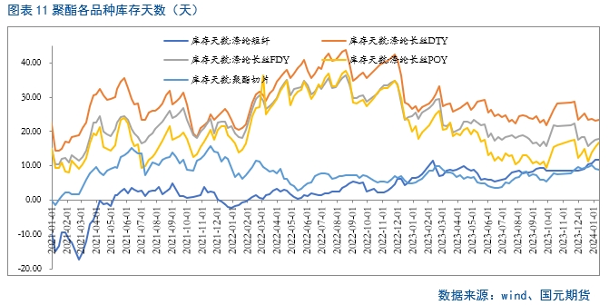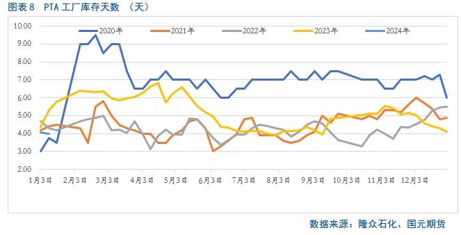 元旦過后,下游聚酯市場已開啟補庫模式,疊加之前廠家?guī)齑嫜永m(xù)低位,導致PTA工廠庫存處于近幾年相對低位。截至1月11日,國內PTA工廠庫存在3.98天,較上周下滑0.07天,較去年同期下滑1.33天。不過當前市場并不缺貨,工廠庫存相對穩(wěn)定。反觀聚酯工廠,PTA原料庫存截至上周四達到7.53天,較前一周上漲0.47天,較去年同期增加0.43天。現貨買盤較少,補貨多為剛需。