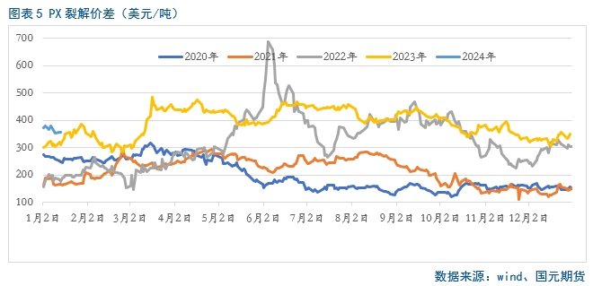 上周隨著前期停車檢修的裝置重啟,國內PX裝置開工率大幅上漲,市場供應增加。據統(tǒng)計,截至1月11日,國內PX裝置開工率達到84.56%,較前一周上漲4.18個百分點,達到近1個月以來的新高,主要是廣東石化260萬噸的裝置以及恒逸文萊150萬的裝置重啟,在國內裝置開工率提升的背景下,亞洲裝置開工率也較前一周上漲了4.95個百分點至77.93%。伴隨著國內供應量的上漲, PX裂解價差呈現小幅收縮。截至上周五,PX裂解價差降至356美元/噸,較節(jié)后第一天下滑4.65個百分點,達到開年以來的相對低位,不過由于下游PTA在一季度有投產的預期,因此對PX的支撐仍在,導致當前的PX裂解價差遠高于近四年同期。