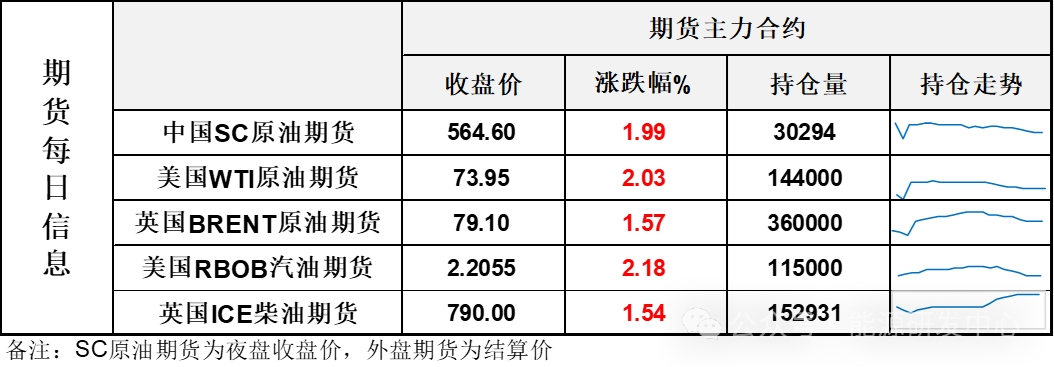 【1】WTI主力原油期貨收漲1.47美元,漲幅2.03%,報(bào)73.95美元/桶;布倫特主力原油期貨收漲1.22美元,漲幅1.57%,報(bào)79.1美元/桶;INE原油期貨收漲1.99%,報(bào)564.6元。