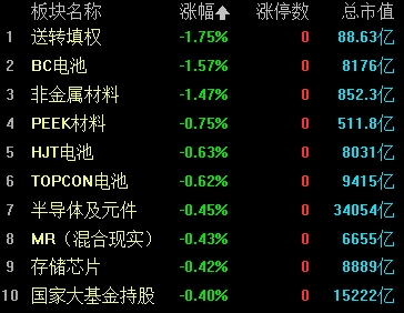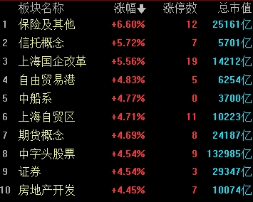 盤面上,保險、證券、上海國企改革板塊漲幅居前,非金屬材料、BC電池、半導(dǎo)體板塊跌幅居前。