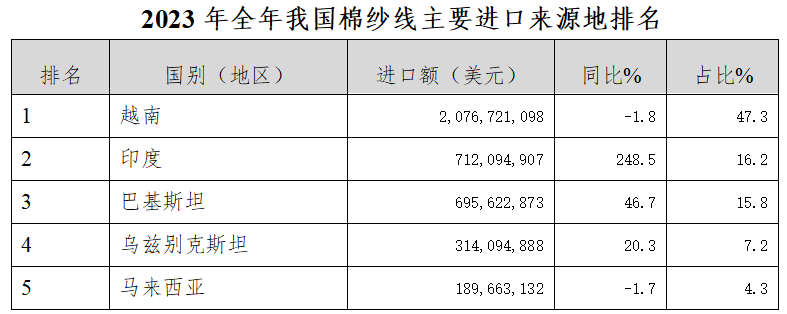 從大類產(chǎn)品看,2023年進(jìn)口棉紗線43.9億美元,同比增長(zhǎng)21.7%,進(jìn)口數(shù)量168.7萬噸,同比增長(zhǎng)43.4%;進(jìn)口化纖13.8億美元,同比下降2.8%;進(jìn)口絲線和羊毛、動(dòng)物紗線分別為302萬美元和1.4億美元,同比增長(zhǎng)5.7%和增長(zhǎng)4%。我國(guó)紗線進(jìn)口以棉紗線為主,占紗線進(jìn)口總額的70%。